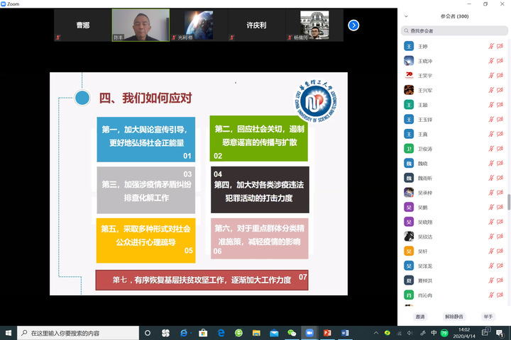陈丰从全民国家安全教育日的设立背景、内容以及总体国家安全观的内涵谈起,重点解读了“社会安全”领域的相关内容。他列举了20世纪以来的几件重大公共卫生事件,分析了由此引发的社会安全问题,如社会恐慌和社会焦虑、社会矛盾和社会冲突、对公众心理造成负面影响等,并提出有效应对社会安全问题的途径:加大舆论宣传引导、回应社会关切、排查化解矛盾纠纷、打击各类涉疫违法犯罪活动以及对社会公众进行心理疏导等。此外,他还介绍了上海高校智库“新时代国家安全研究中心”围绕社会安全方面开展的工作。回答了师生有关“疫情对脱贫工作的影响”、“疫情后大众消费引导”、“老员工该如何提高国家安全意识”等问题。