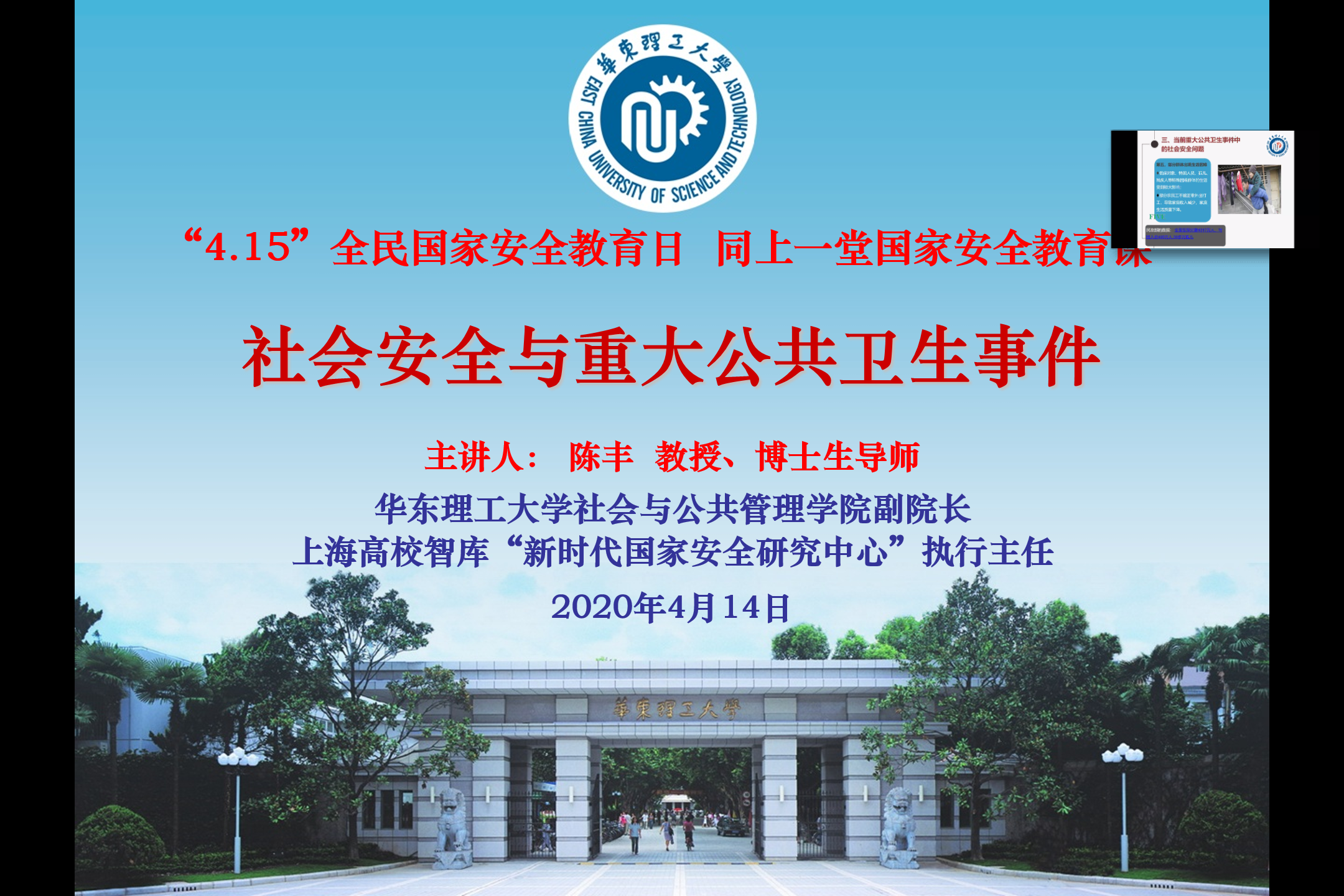 4月14日下午,88858cc永利官网“新时代学习大讲堂”开展国家安全日主题教育“云”学习活动。特邀请社会与公共管理学院副经理、上海高校智库“新时代国家安全研究中心”执行主任陈丰教授做了题为《重大公共卫生事件中的社会安全问题及其应对》的讲座。学院教职工、员工党员、入党积极分子、公派留学在国外的员工等300人齐聚线上学习,会议由公司党委书记修光利主持。