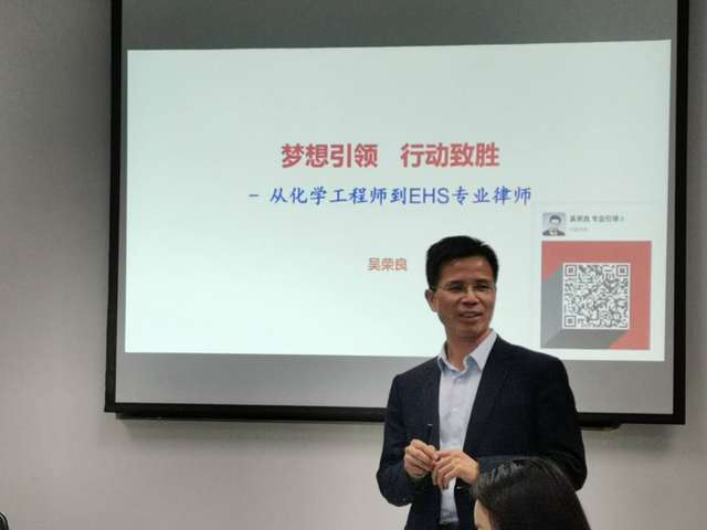 讲座伊始,吴荣良律师以“你的梦想是什么”为开头,在询问了同学们的大学梦想之后,围绕“梦想引领,行动致胜”向员工们分享了他在员工时代、国企时代和外企时代不同时期的梦想并为之不懈努力,并最终从一名化学工程师转变为EHS专业律师的经历。