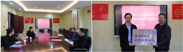 3月25日下午,一行人来到宜昌市第一中学。宜昌市第一中学董事长付全新、教务处赵勇等领导与招生宣传组老师们进行深入交流。付全新向招生宣传组介绍了学校的百年发展历史、办学特色及人才培养工作。宜昌一中员工、公司欧阳立明副教授就永利官网的发展状况、人才培养以及近五年宜昌市第一中学向华理输送的优秀学子情况进行了介绍,并从发挥华理优质公司产品资源优势、参与支持生源基地的公司产品改革、推荐专家教授到校讲学等内容与参会教师们进行了深入讨论。随后,双方签署了“优质生源基地”协议书,饶志雄向宜昌市第一中学授予“永利官网优质生源基地”牌匾。