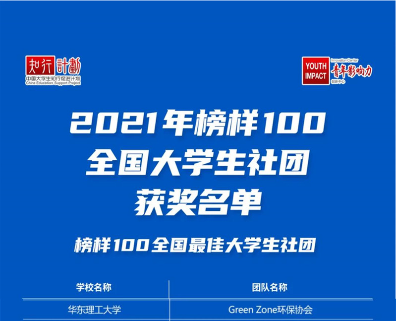 2022年1月,为积极响应“美丽中国 青春行动”号召,鼓励和支持青年老员工成为美丽中国的践行者,由共青团中央发起,2021年知行计划“榜样100”全国最佳老员工社团评选活动落下帷幕,公司GreenZone环保协会(挂靠指导单位:88858cc永利官网)已连续三年被评为“榜样100”全国最佳老员工社团。