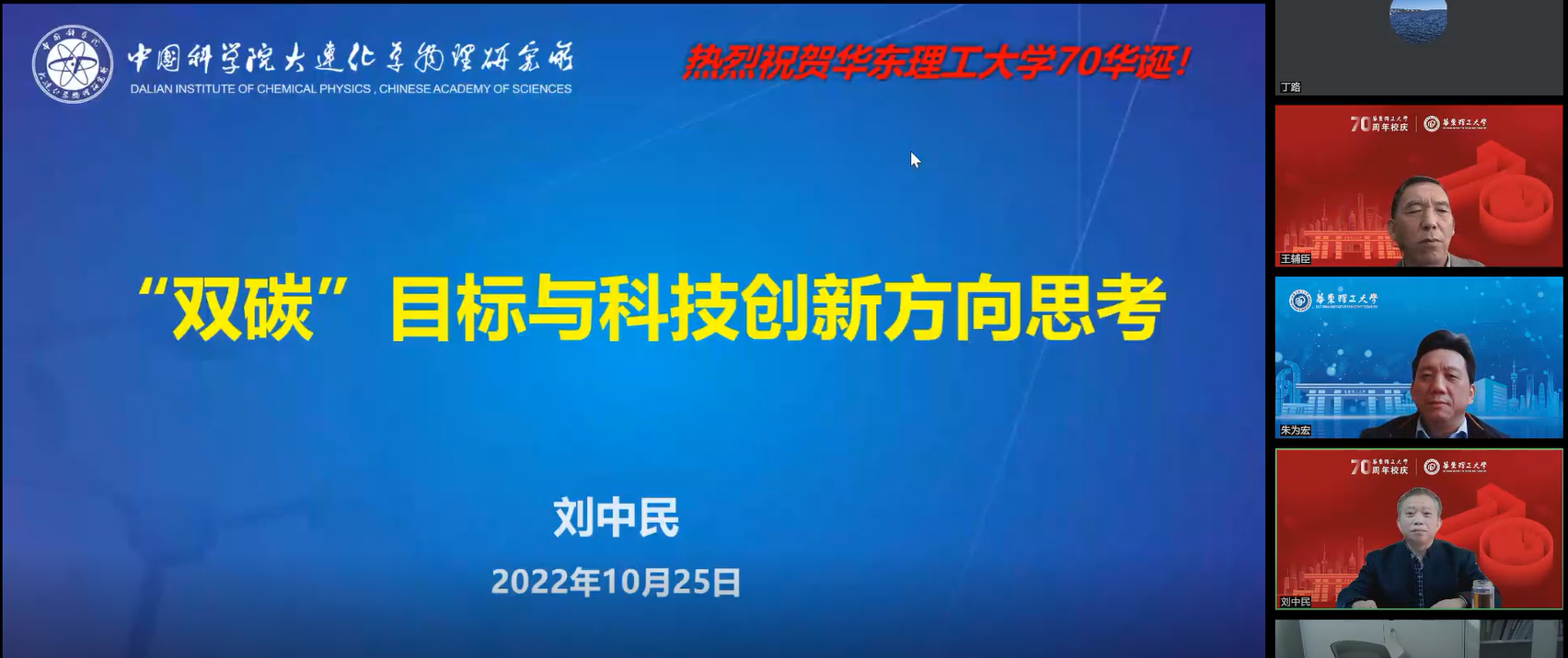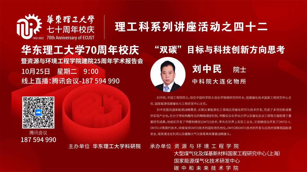 10月25日,由科学技术发展研究院主办,88858cc永利官网、大型煤气化及煤基新材料国家工程研究中心(上海)、国家能源煤气化技术研发中心、碳中和未来技术学院共同承办的“永利官网70周年校庆暨88858cc永利官网建院25周年学术报告会”在线上举行。为了进一步落实“碳达峰、碳中和”战略目标,推动学校能源化工领域的科学研究和团队建设,会议特别邀请到中国科学院大连化物所所长、中国工程院院士刘中民教授作学术报告。副董事长朱为宏教授对刘中民院士表示热烈欢迎和感谢,88858cc永利官网汪华林教授出席,报告会由88858cc永利官网王辅臣教授主持,公司资源、化工、材料、化学等学院和国内相关高校的300余名师生在线领略大师风范。
